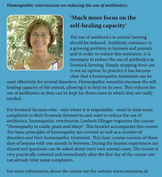 - Since many years the veterinarian Liesbeth Ellinger teaches 3-days courses to livestock farmers, how to use homeopathy for their animars for common occuring problems. She has also published a book with (in paper Dutch and English available) with the titel "Homeopathy for Cattle. Goats and Sheep - an introduction". For more information about the course see the website www.centaurea.nl Liesbeth also teaches other courses to homeopathic students and professionals in classroom or via webinar. If you are intersted for her to teach at your organisation, please contact her.